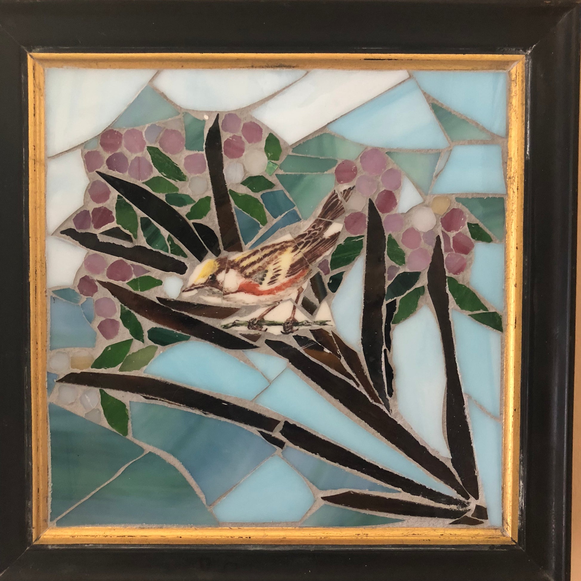 This sweet Chestnut-sided Warbler sitting in a cherry blossom tree was created with broken china and stained glass. Each piece was hand-cut by me and glued using Weldbond to a vintage frame that once belonged to my grandmother. It was grouted using sanded grout. This item is already made and ACTUAL ITEM IS SHOWN.