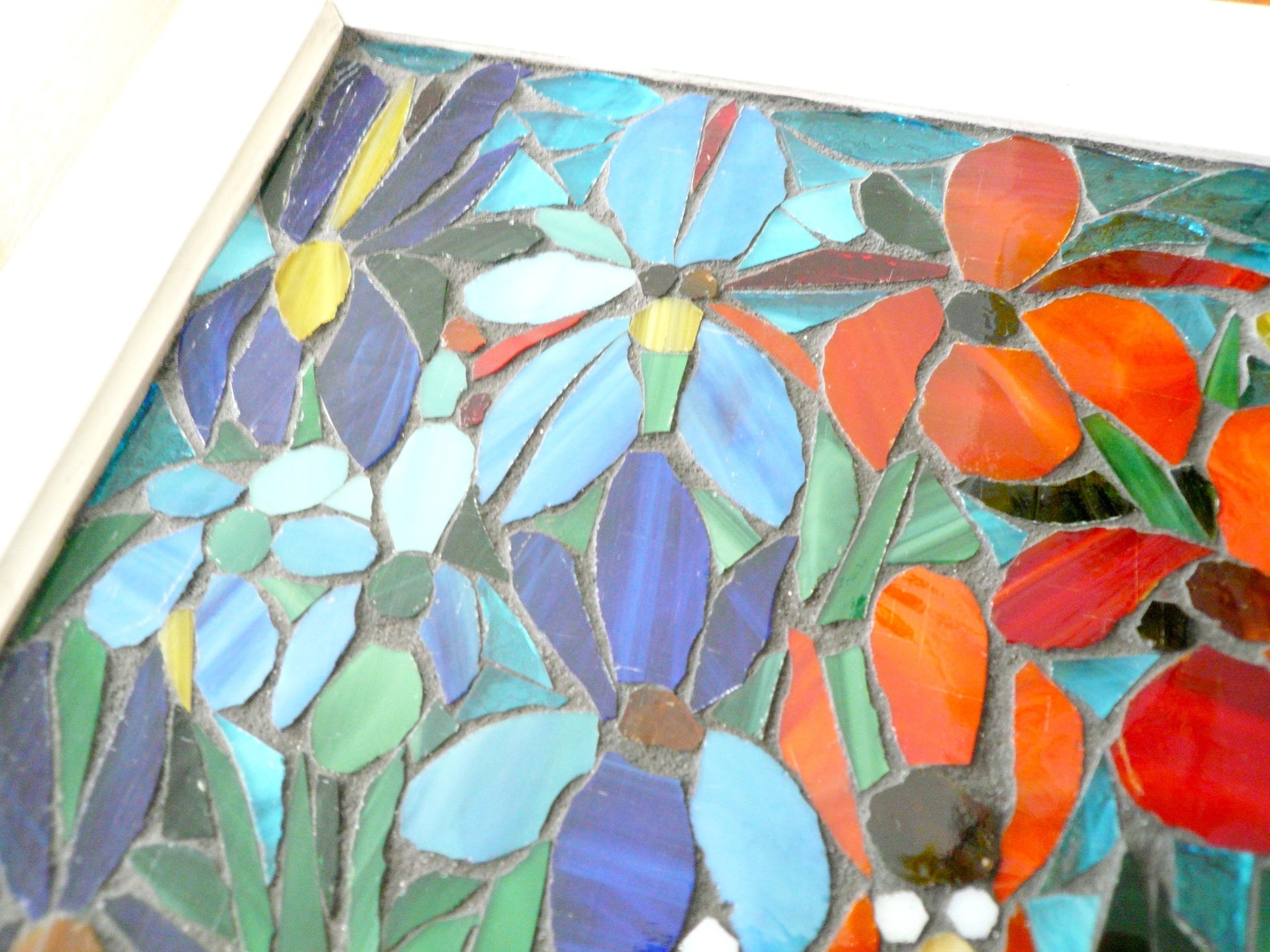 Just say iris, and the size and frame style you prefer. For most of my work, I start with a general sketch/design and as I start cutting the glass, it goes from there. I collaborate with the client as much or as little as they like. All of my stained glass window and panel mosaics are made on salvaged window frames, handmade frames or cement board and can be hung in a window or on a wall.