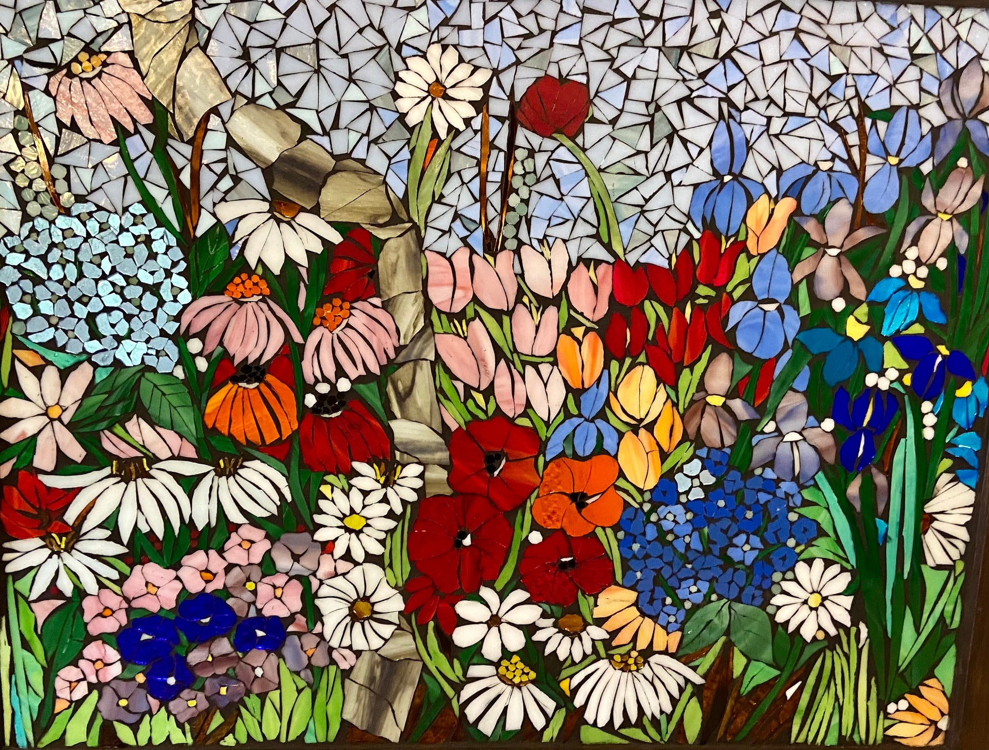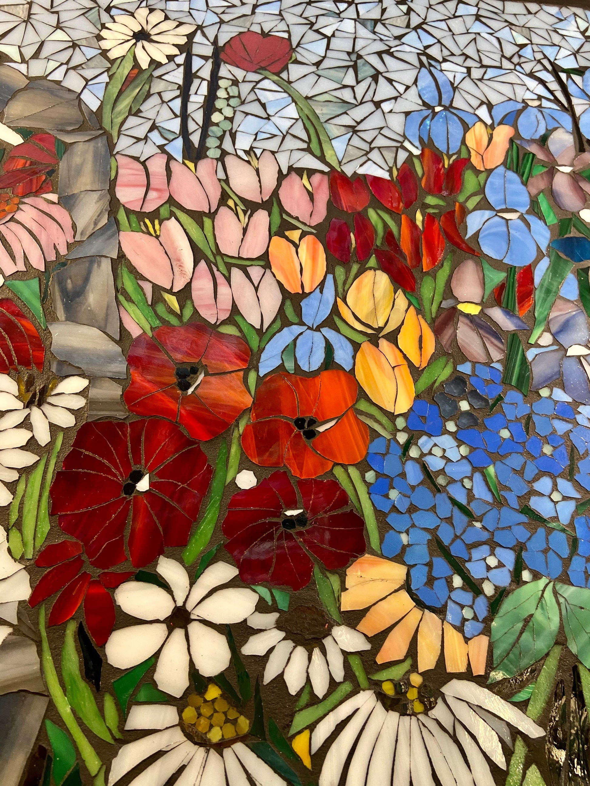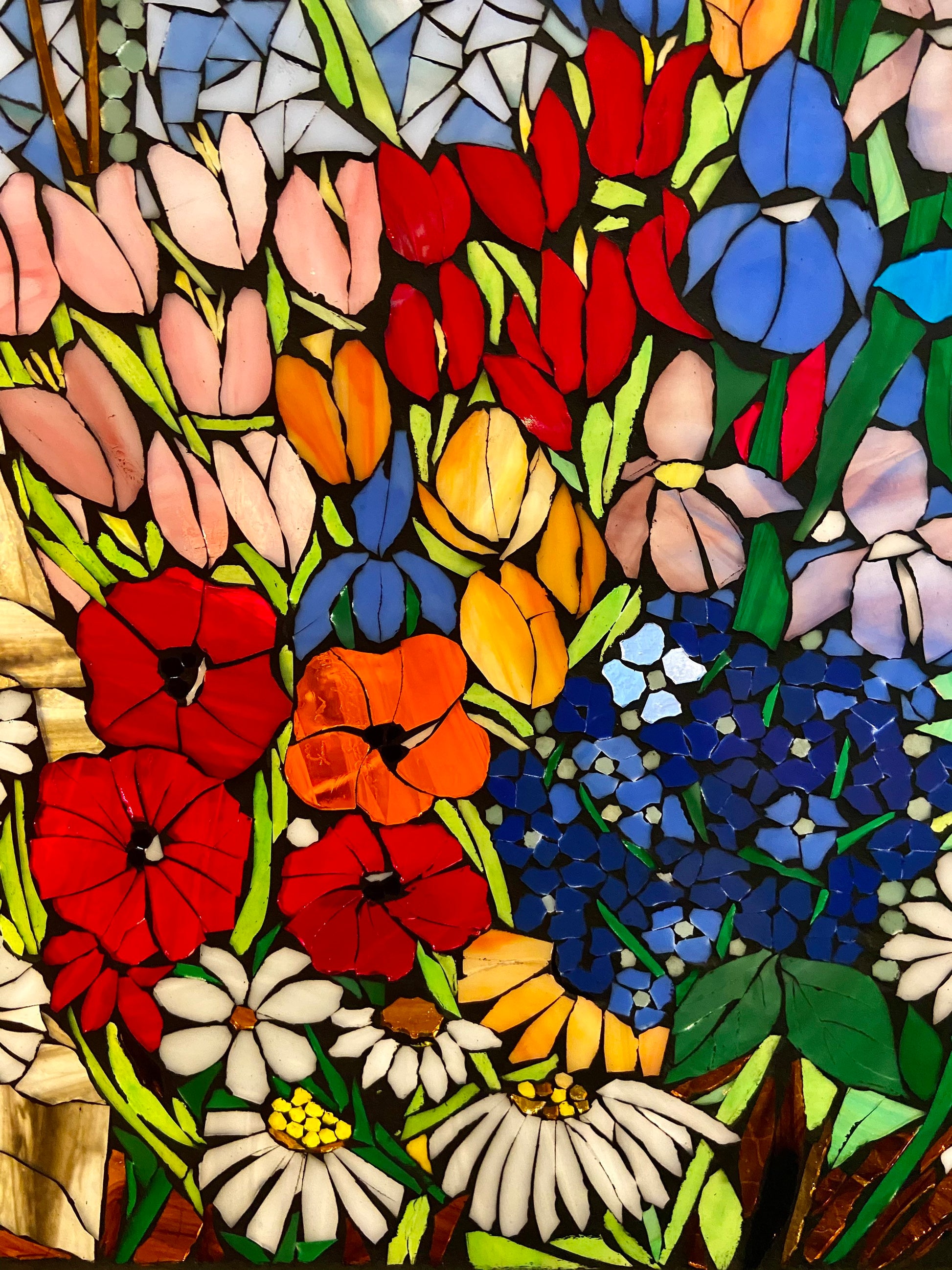 Just say mixed flowers, and the size and frame style you prefer. For most of my work, I start with a general sketch/design and as I start cutting the glass, it goes from there. I collaborate with the client as much or as little as they like. All of my stained glass window and panel mosaics are made on salvaged window frames, handmade frames or cement board and can be hung in a window or on a wall.