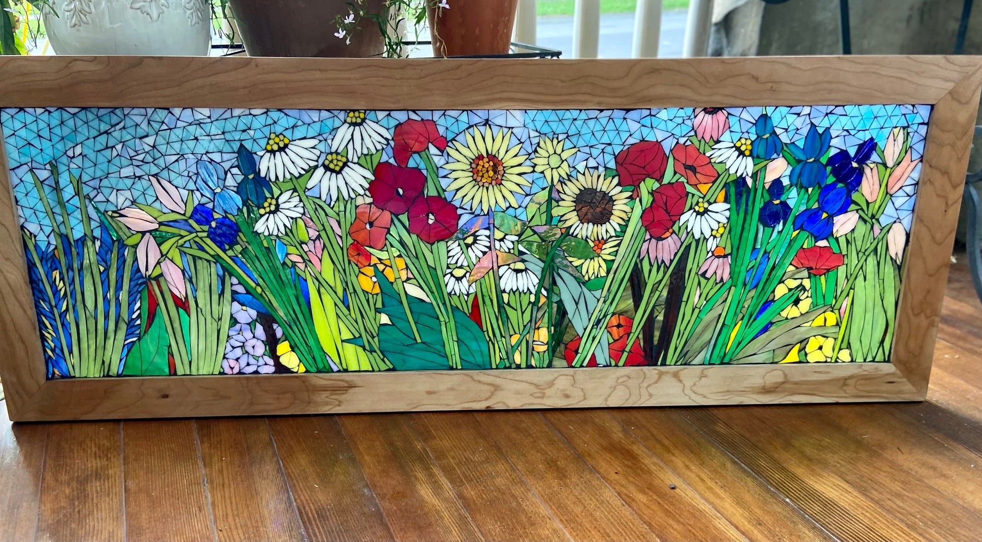 Just say mixed flowers, and the size and frame style you prefer. For most of my work, I start with a general sketch/design and as I start cutting the glass, it goes from there. I collaborate with the client as much or as little as they like. All of my stained glass window and panel mosaics are made on salvaged window frames, handmade frames or cement board and can be hung in a window or on a wall.