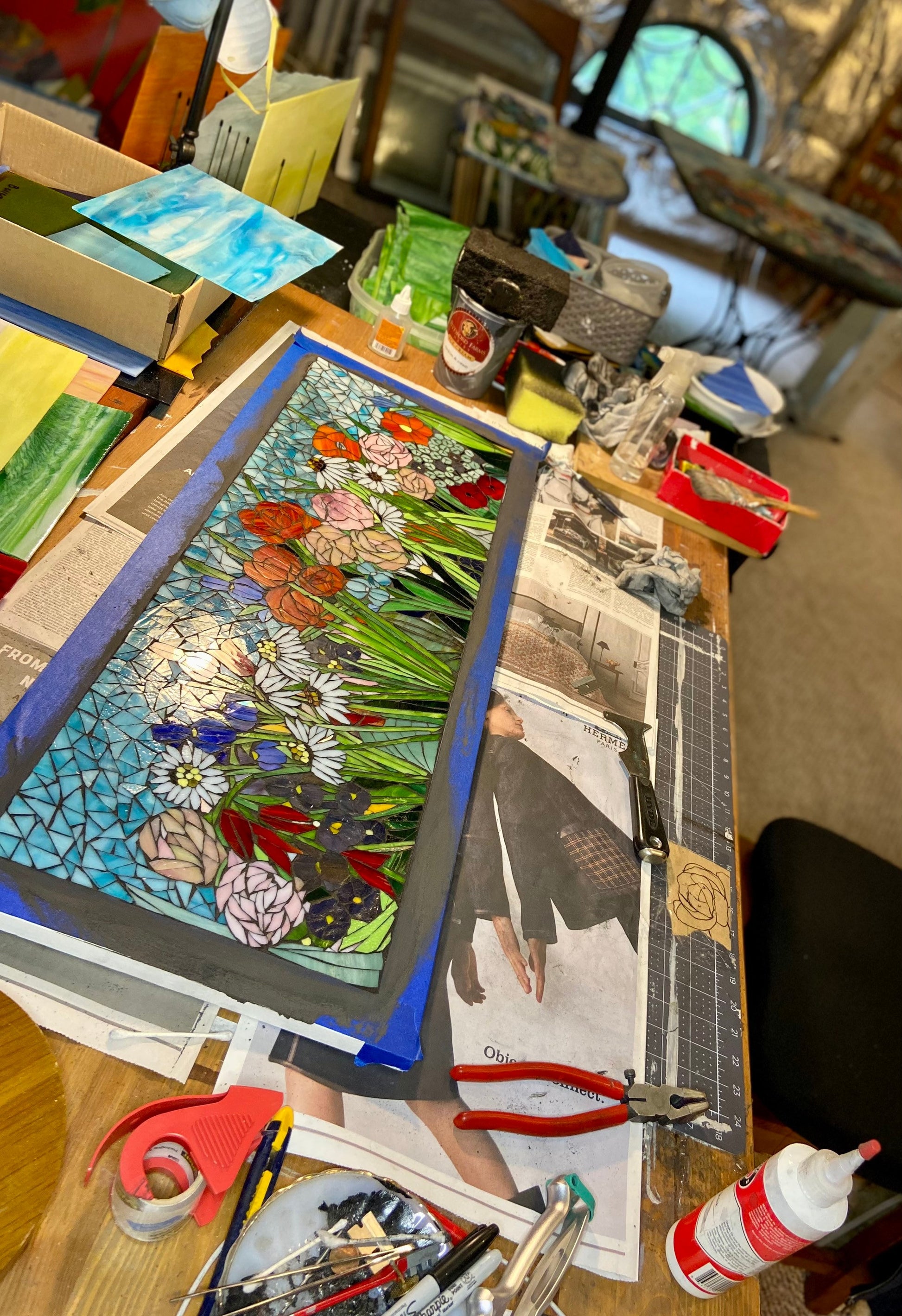 Just say mixed flowers, and the size and frame style you prefer. For most of my work, I start with a general sketch/design and as I start cutting the glass, it goes from there. I collaborate with the client as much or as little as they like. All of my stained glass window and panel mosaics are made on salvaged window frames, handmade frames or cement board and can be hung in a window or on a wall.
