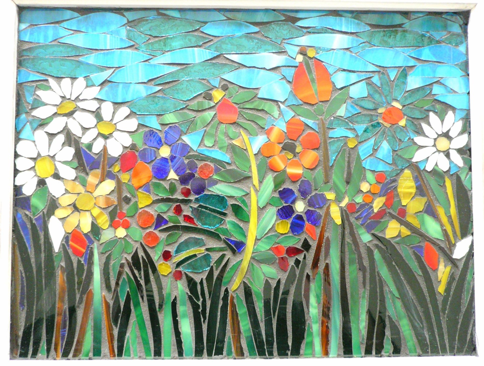 Just say mixed flowers, and the size and frame style you prefer. For most of my work, I start with a general sketch/design and as I start cutting the glass, it goes from there. I collaborate with the client as much or as little as they like. All of my stained glass window and panel mosaics are made on salvaged window frames, handmade frames or cement board and can be hung in a window or on a wall.