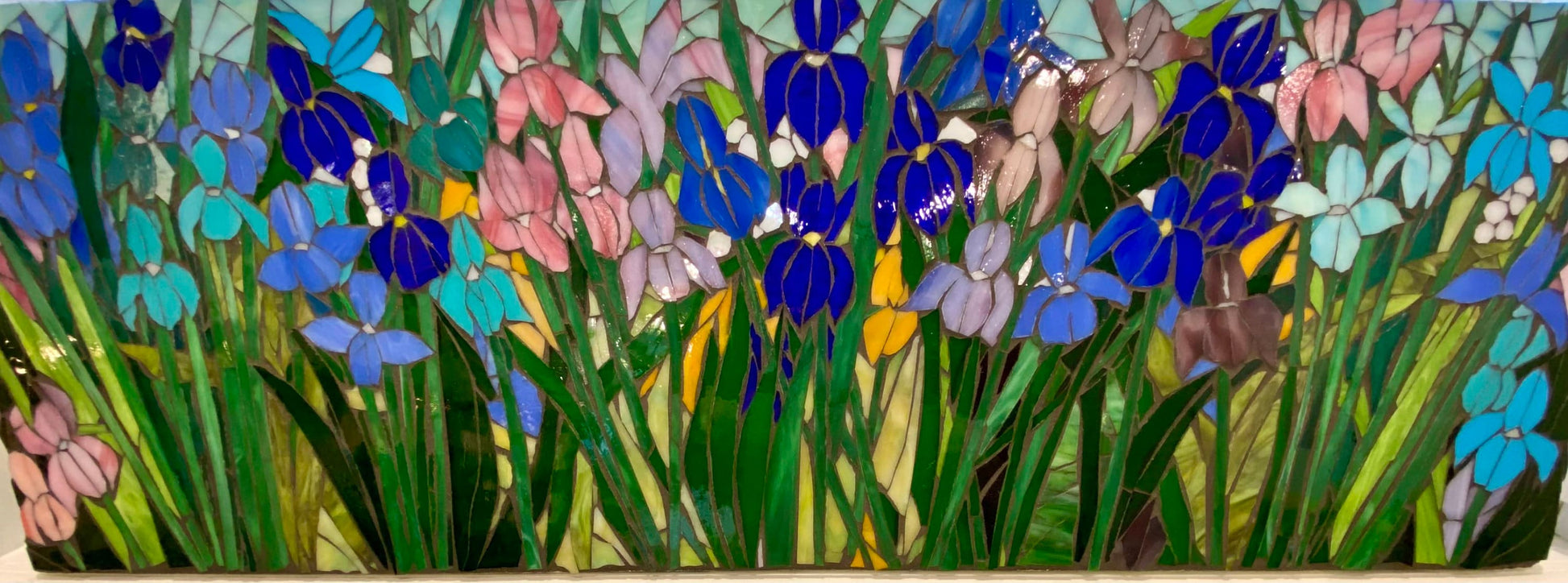 Mixed Irises stained glass window. Framed hanging glass art. Large garden mosaic wall art. Gift idea for all shades of blue.