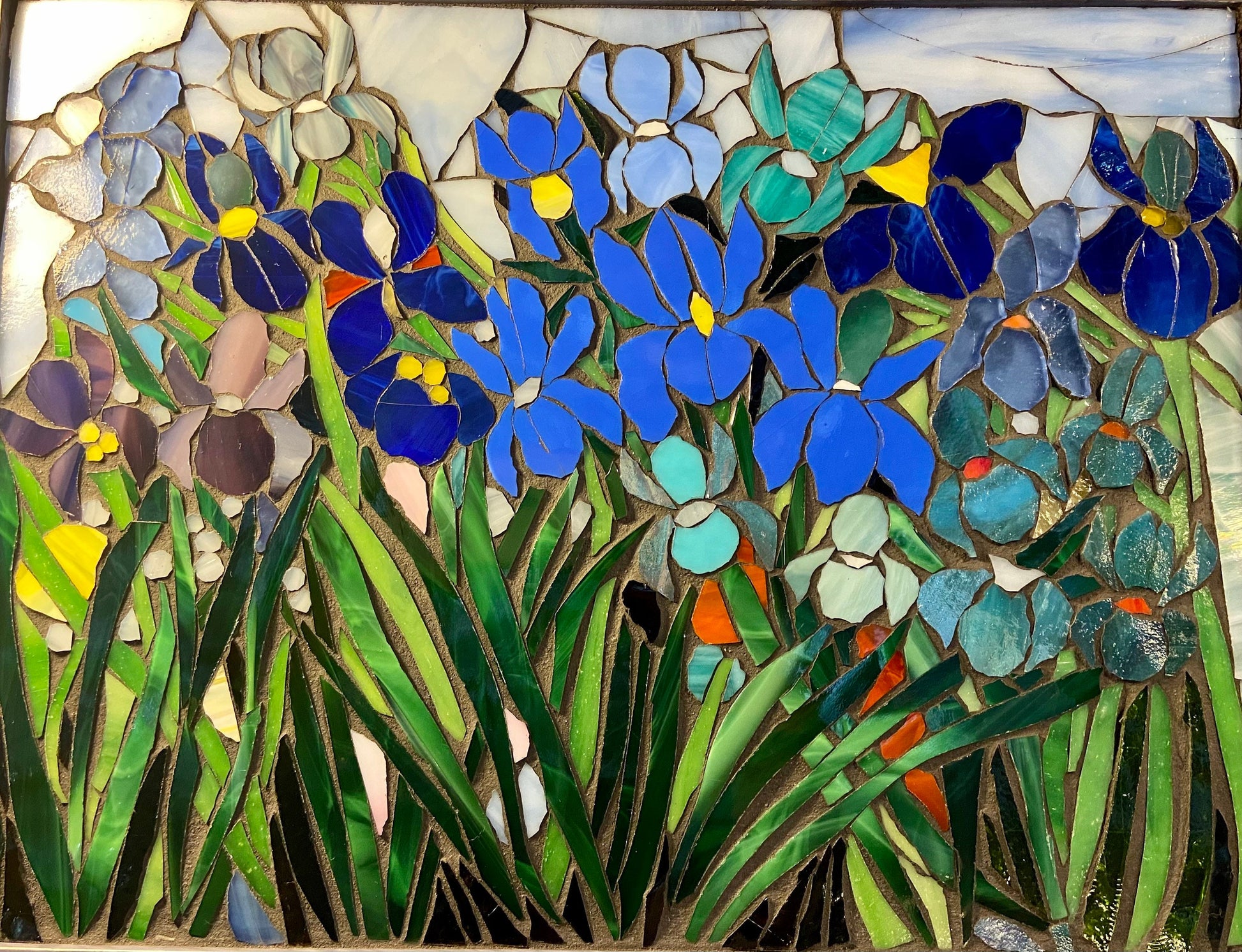 Just say mixed flowers, and the size and frame style you prefer. For most of my work, I start with a general sketch/design and as I start cutting the glass, it goes from there. I collaborate with the client as much or as little as they like. All of my stained glass window and panel mosaics are made on salvaged window frames, handmade frames or cement board and can be hung in a window or on a wall.