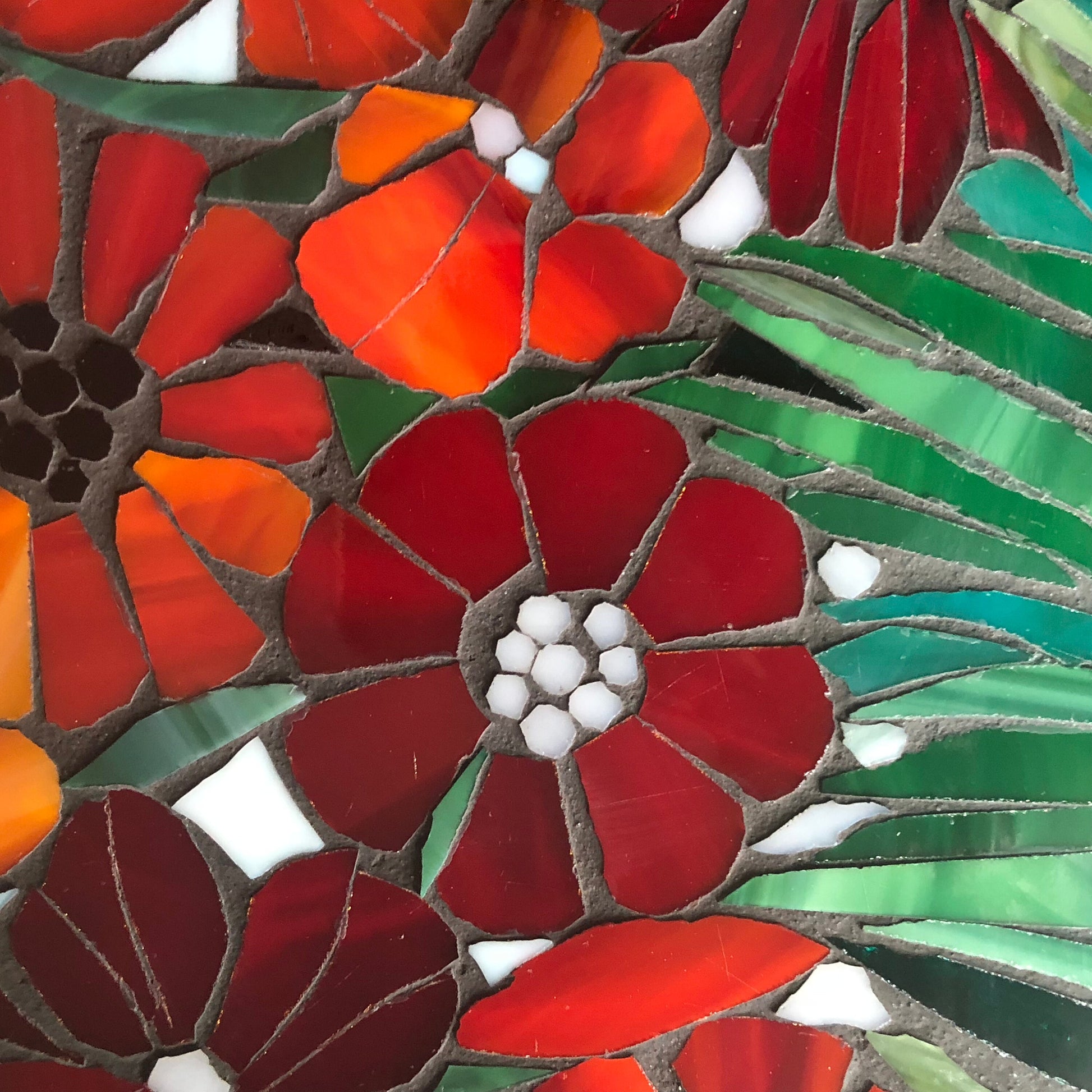 Just say poppies, and the size and frame style you prefer. For most of my work, I start with a general sketch/design and as I start cutting the glass, it goes from there. I collaborate with the client as much or as little as they like. All of my stained glass window and panel mosaics are made on salvaged window frames, handmade frames or cement board and can be hung in a window or on a wall.
