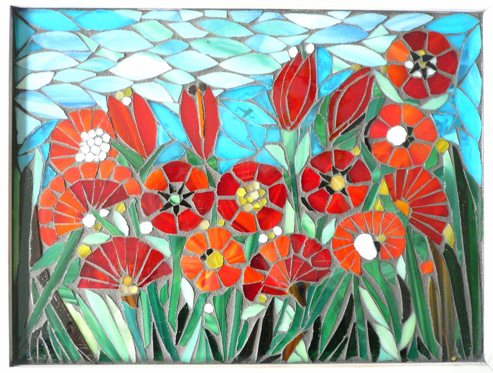 Mosaic poppy window, red stained glass window, garden mosaic art, mosaic flowers, flower art, poppies, poppy mosaic, wall art