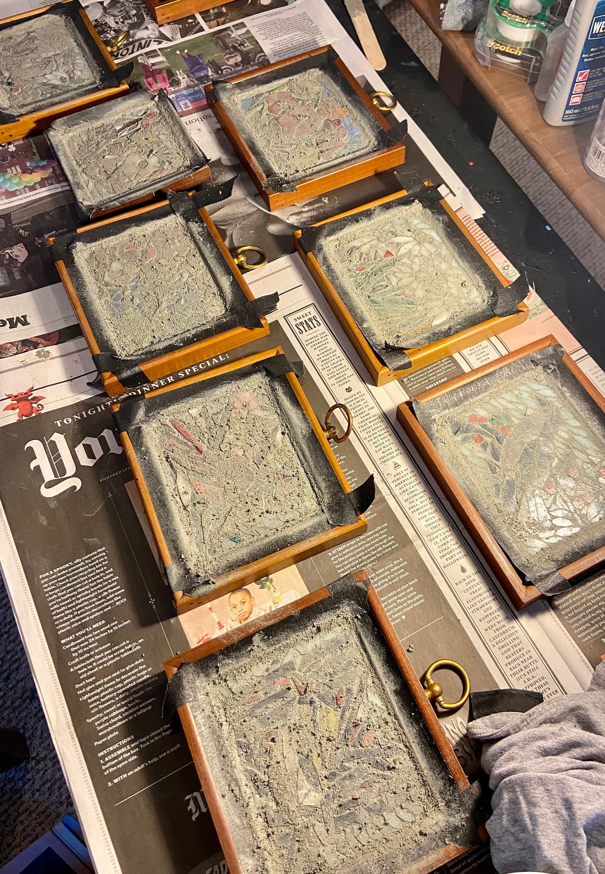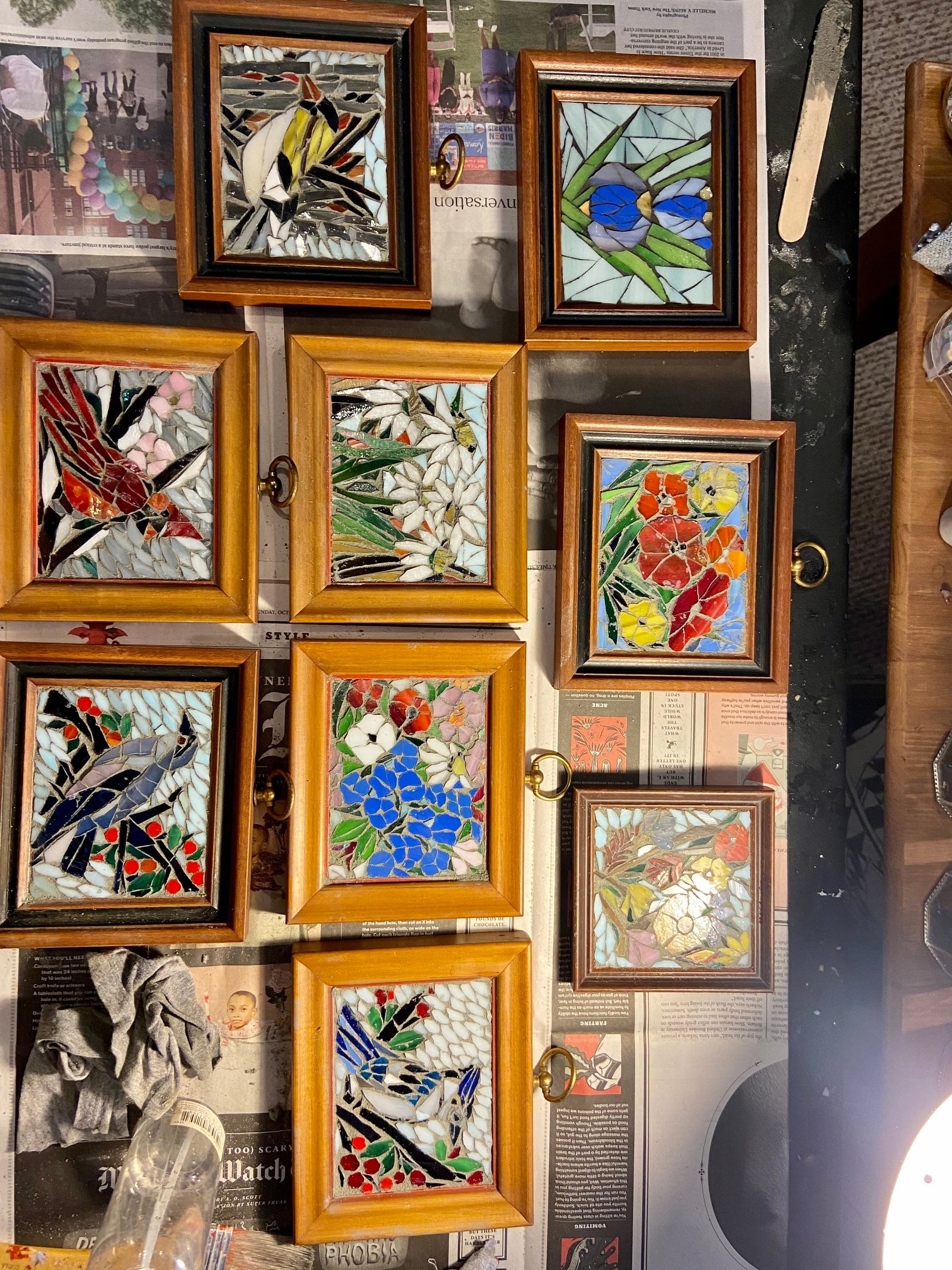 Small stained glass mosaic art. I enjoyed creating these smaller versions of my larger mosaics. Perfect holiday, Valentine's, Mother's Day gift idea. All of these pieces were created with hand-cut stained glass. Each piece was hand-cut by me and individually glued using Mac glue to antique frames, which once belonged to my grandmother. They were grouted using sanded grout.