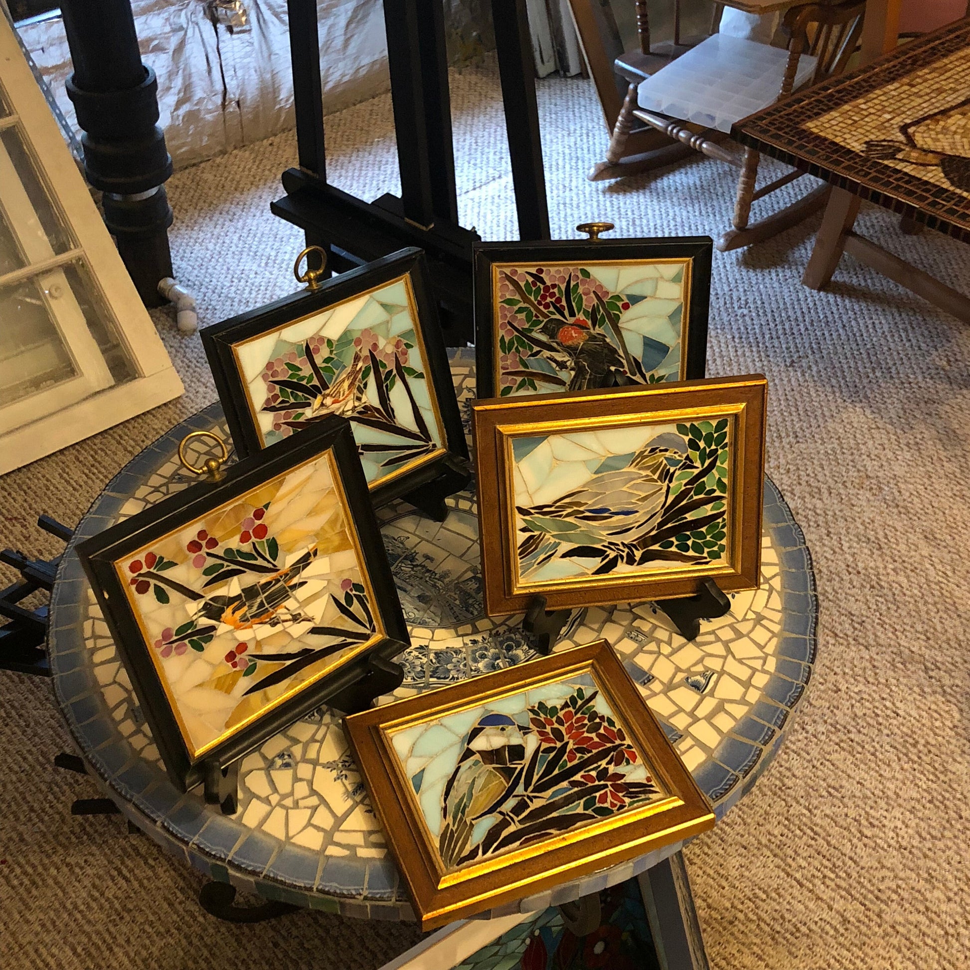 Small stained glass mosaic art. I enjoyed creating these smaller versions of my larger mosaics. All of these pieces were created with hand-cut stained glass. Each piece was hand-cut by me and individually glued using Mac glue to antique frames, which once belonged to my grandmother. They were grouted using sanded grout.